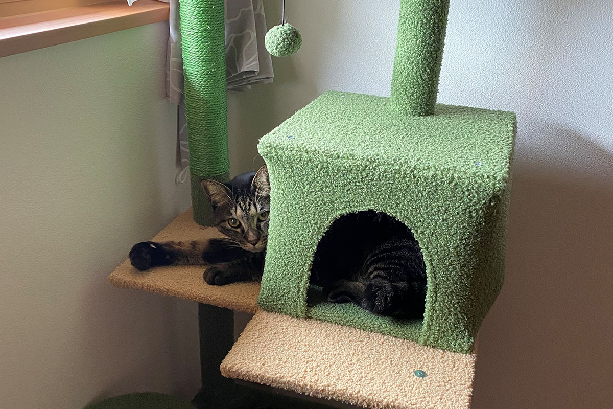 そんな母から、今年の母の日に「キャットタワーが欲しい」とリクエストがあり、プレゼントしたのですが――猫たちは、全然登らず、試しに無理やり乗せてみても、すぐにぴょんっと降りてきちゃうようで。「そのうち慣れるやろう」と母は言っていましたが、2ヶ月経っても、猫たちは完全スルー。