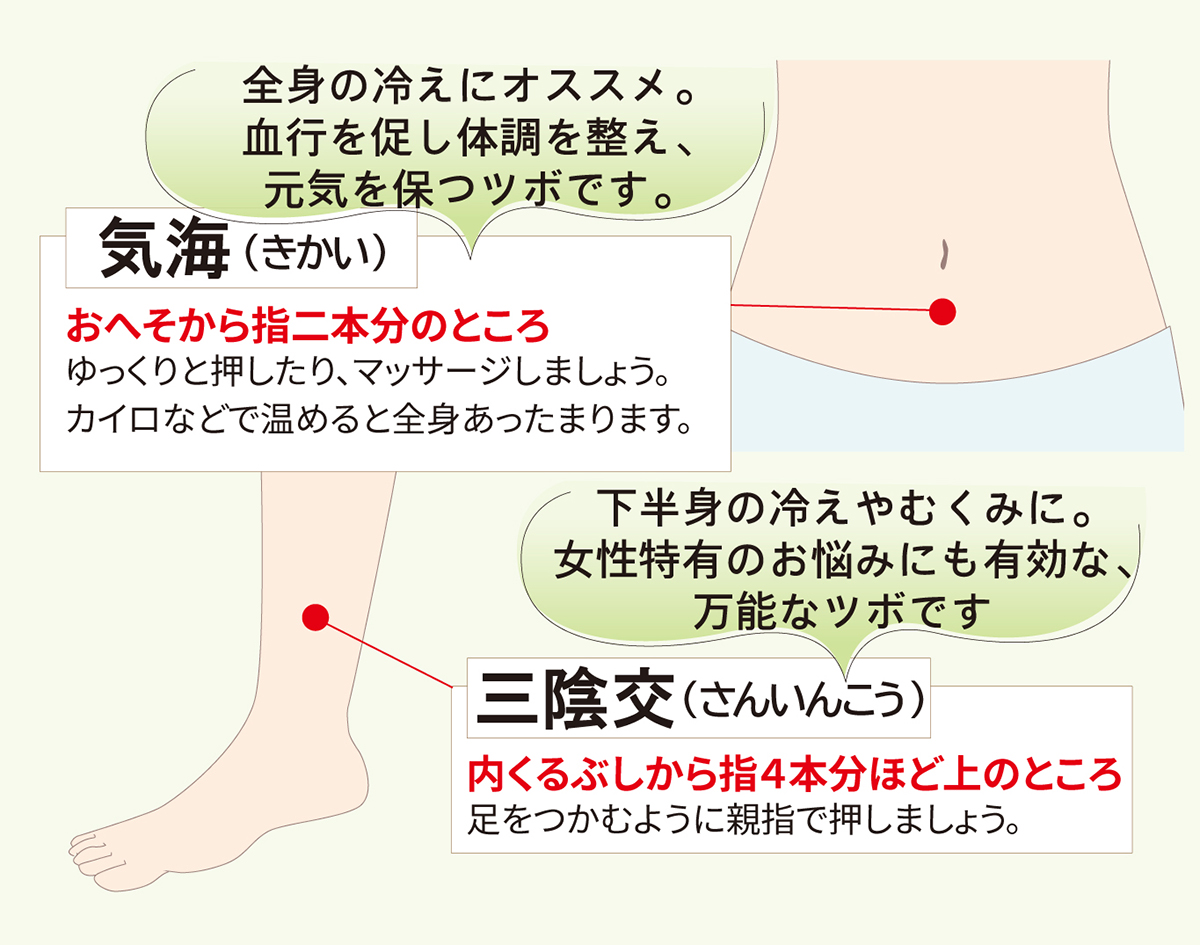全身の冷えにオススメ。血行を促し体調を整え、元気を保つツボです。